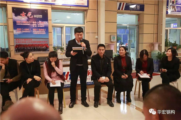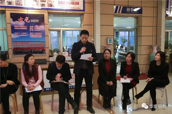 2016年12月15日15時,華宏鋼構(gòu)2016年度十大標(biāo)兵評選會議在公司總部陽光大廳召開,會議由行政**經(jīng)理李德偉主持,朱宏志、朱宏勇、劉肖、張章、高霞、林春、潘宏娟、崔鳳蘭、王學(xué)東、王天宇、徐海峰、孫曉麗、苑孝南、張雪立、牟桂梅、周立彬、牟永平、王忠明、劉文舉、趙影、朱宏基等人參加了會議,同時會議還邀請了各車間和辦公室基層家人列席了會議。