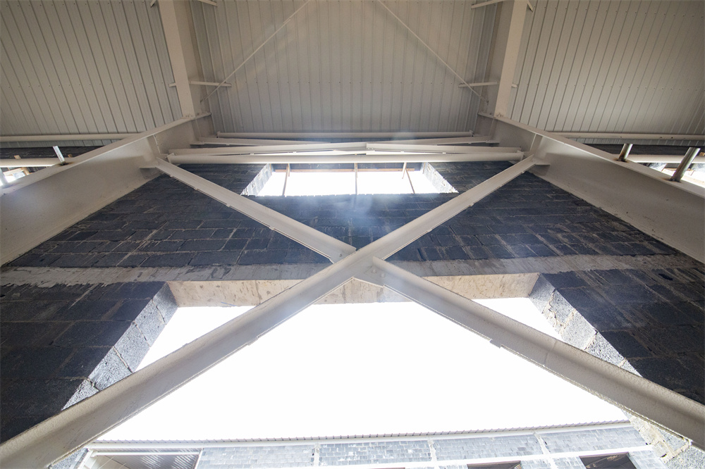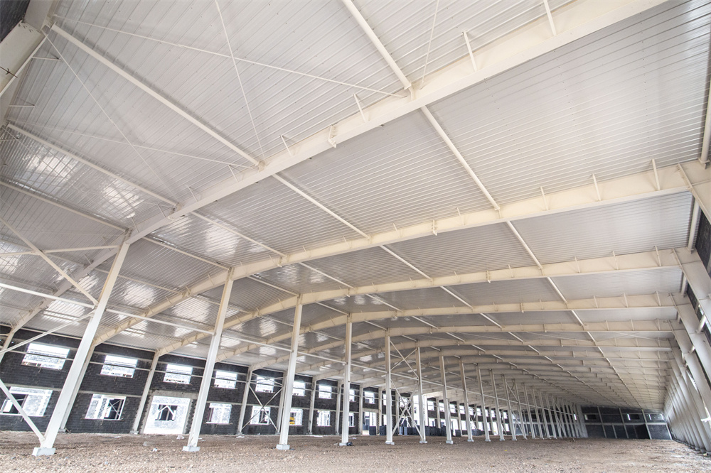 項目特點:本工程為共計兩棟單體1-廠房、2-廠房。廠房長度159.3m、寬度46m、檐口高度8.1m。局部二層為混凝土結構。室內(nèi)外墻體均為土建墻體,屋面保溫為雙層75mm厚玻璃絲綿現(xiàn)場復合板,屋面外板為820型角馳板。室內(nèi)屋面懸掛噴淋系統(tǒng),土建墻體與鋼結構連接節(jié)點復雜,混凝土結構施工與鋼結構施工交叉作業(yè),增加施工難度。